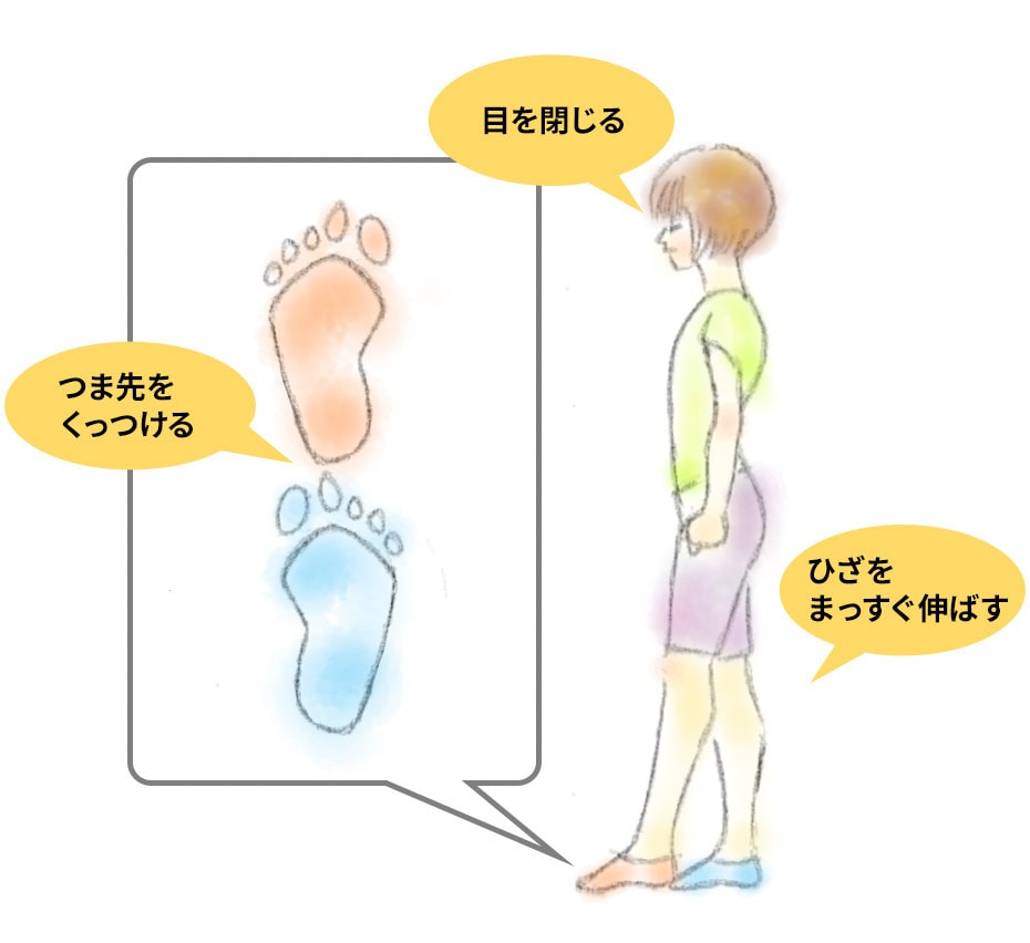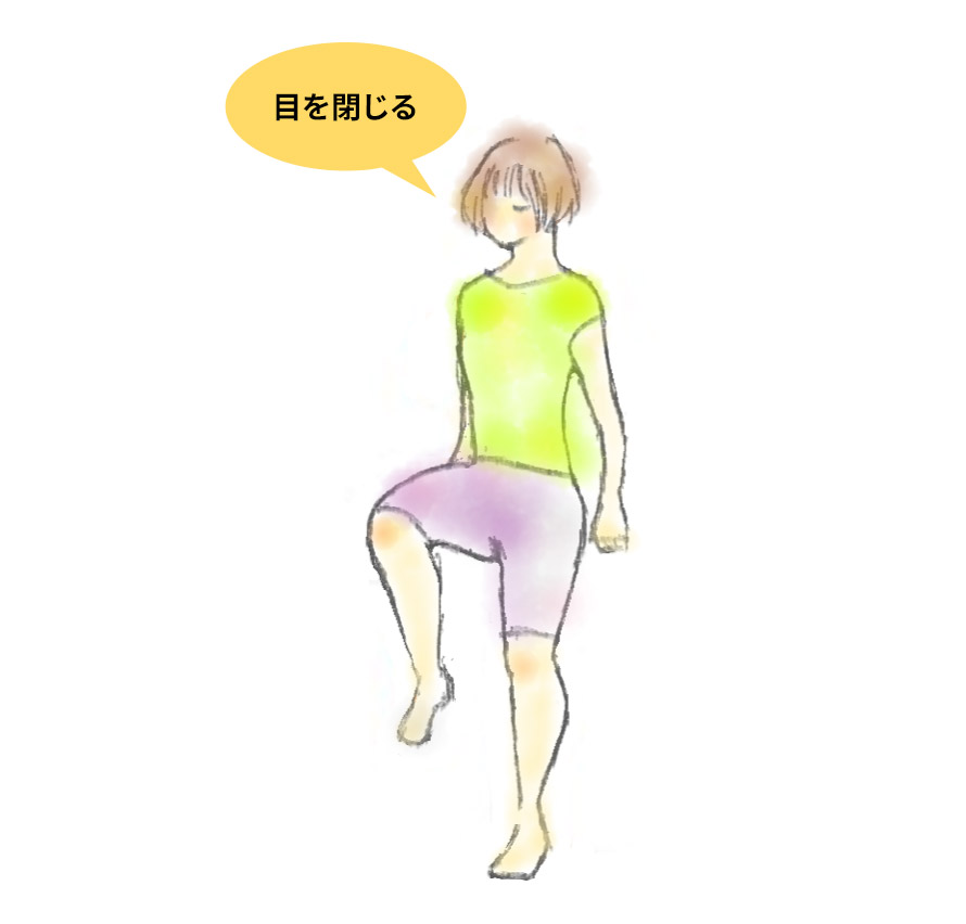 図のように、目を閉じ、片足で立つ姿勢が何秒の間続けられるか、数えてください。