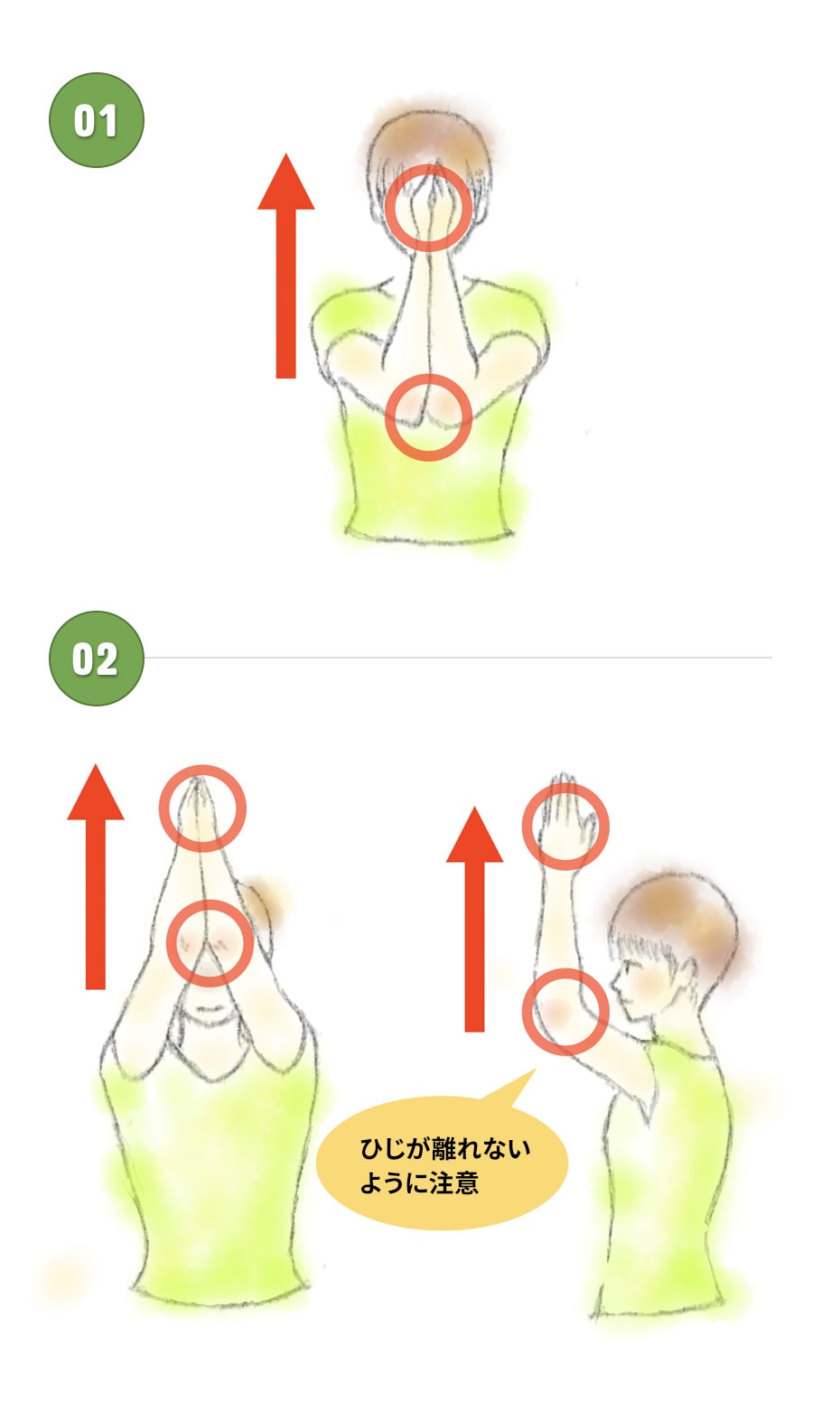 (2)両手・両ひじをくっつけたまま、うでを上げていきます。