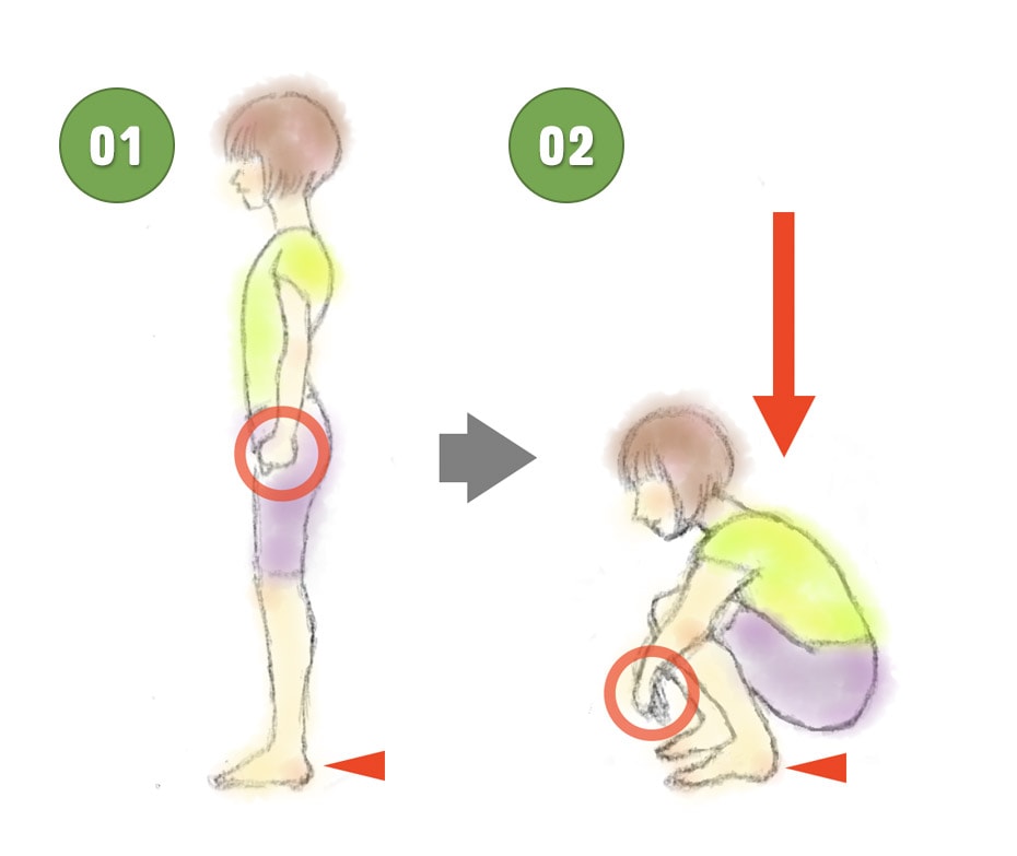 ・しゃがむ途中、両手は、からだの横から、ひざを抱えるように移動させます。